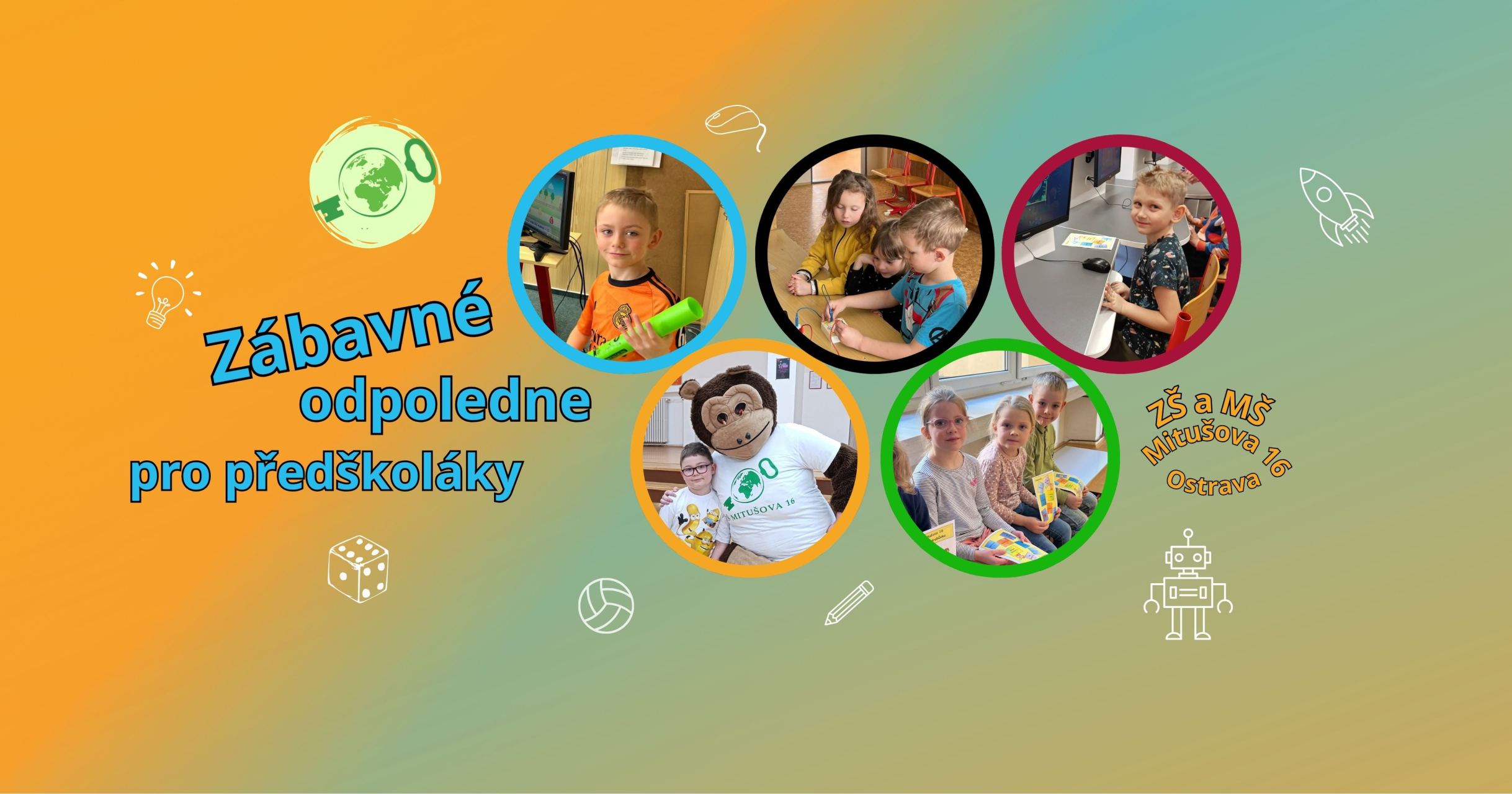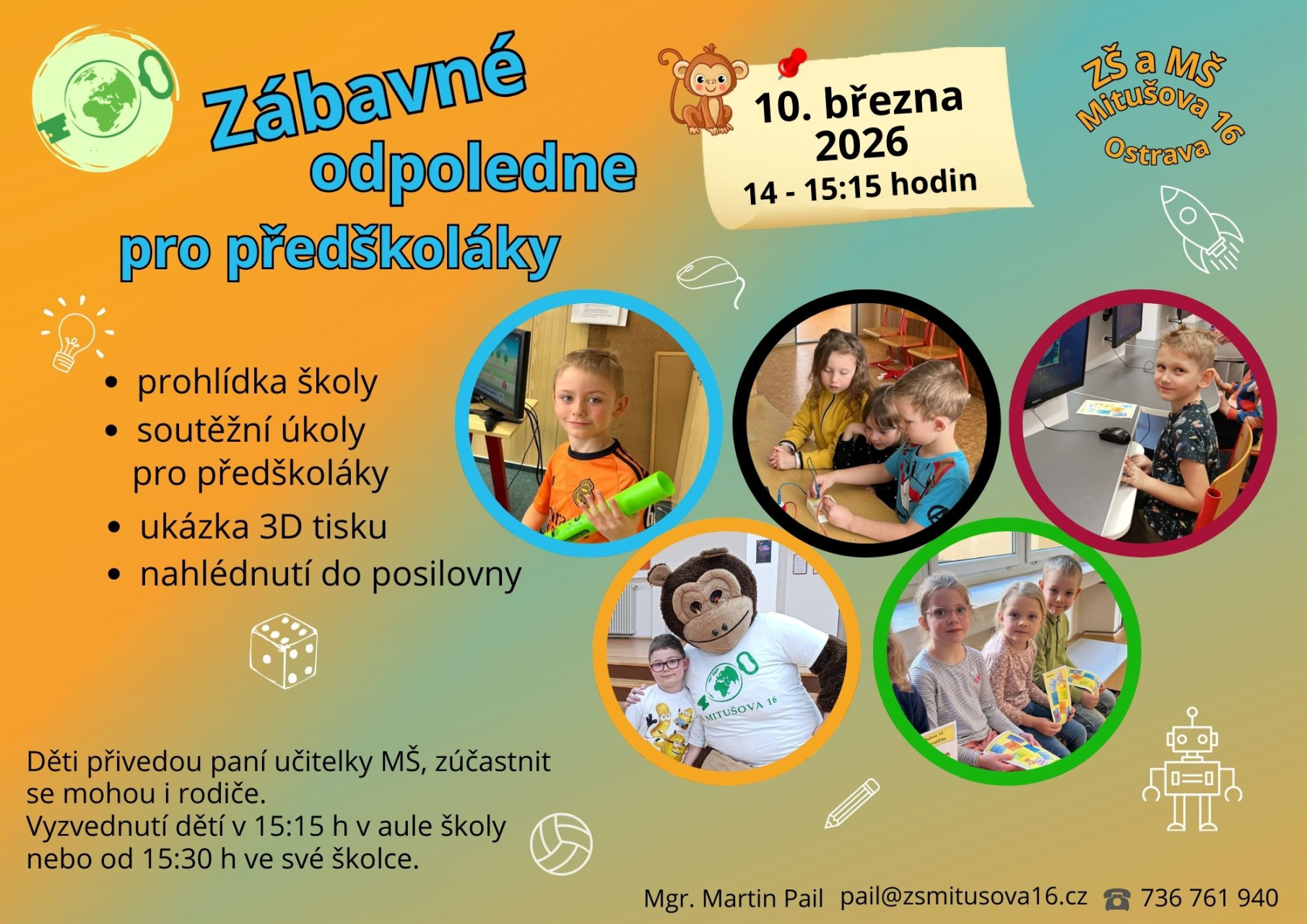 Paní učitelky MŠ Mitušova 6 a MŠ Mitušova 90 přivedou děti na akci do budovy školy, zúčastnit se mohou i rodiče. Své děti si pak můžete vyzvednout v 15:15 hodin v aule školy nebo od 15:30 hodin ve své školce.