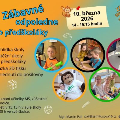 Dne 10. března 2026 proběhne v budově školy zábavné odpoledne pro budoucí prvňáčky v době od 14 - 15:15 hodin.