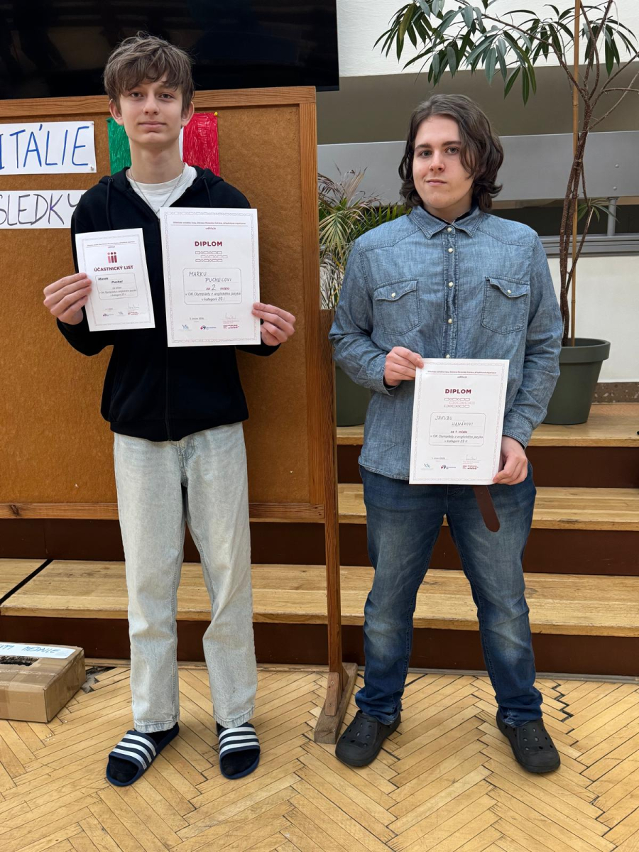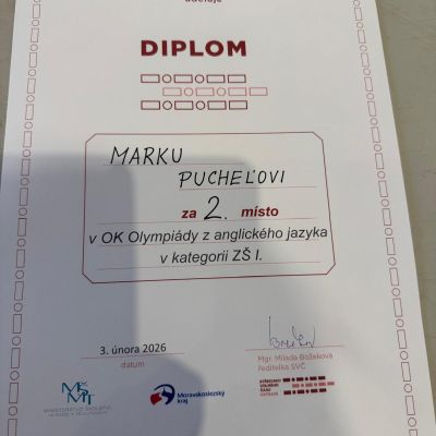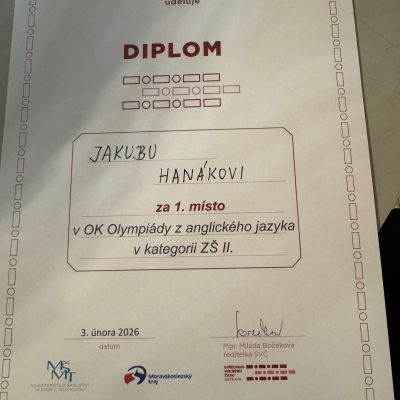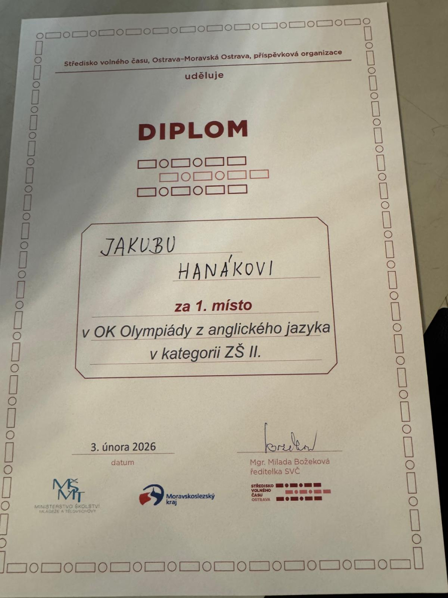 Gratulujeme našim úspěšným účastníkům okresního kola olympiády v anglickém jazyce. Chlapci se blýskli svými perfektními znalostmi a v letošním opravdu hojně obsazeném a velkou konkurencí nabitém okresním kole získal Marek Puchel' 2.místo v kategorii ZŠ I a Jakub Hanák vybojoval 1.místo v kategorii ZŠ II.