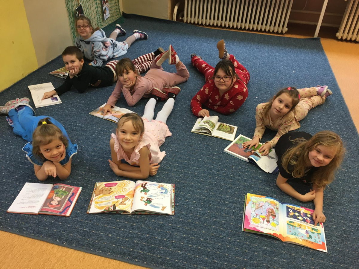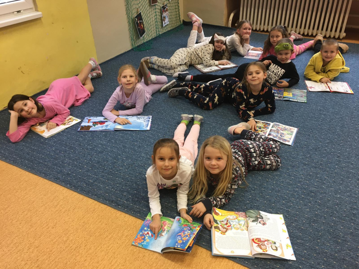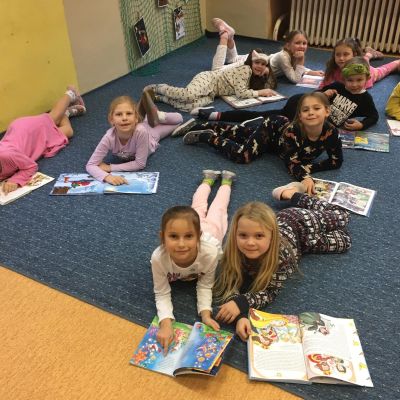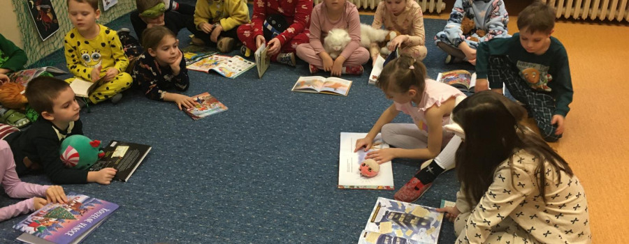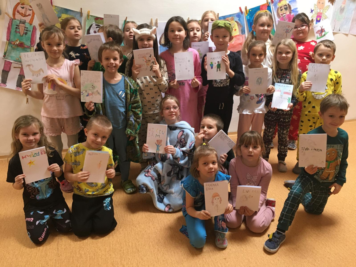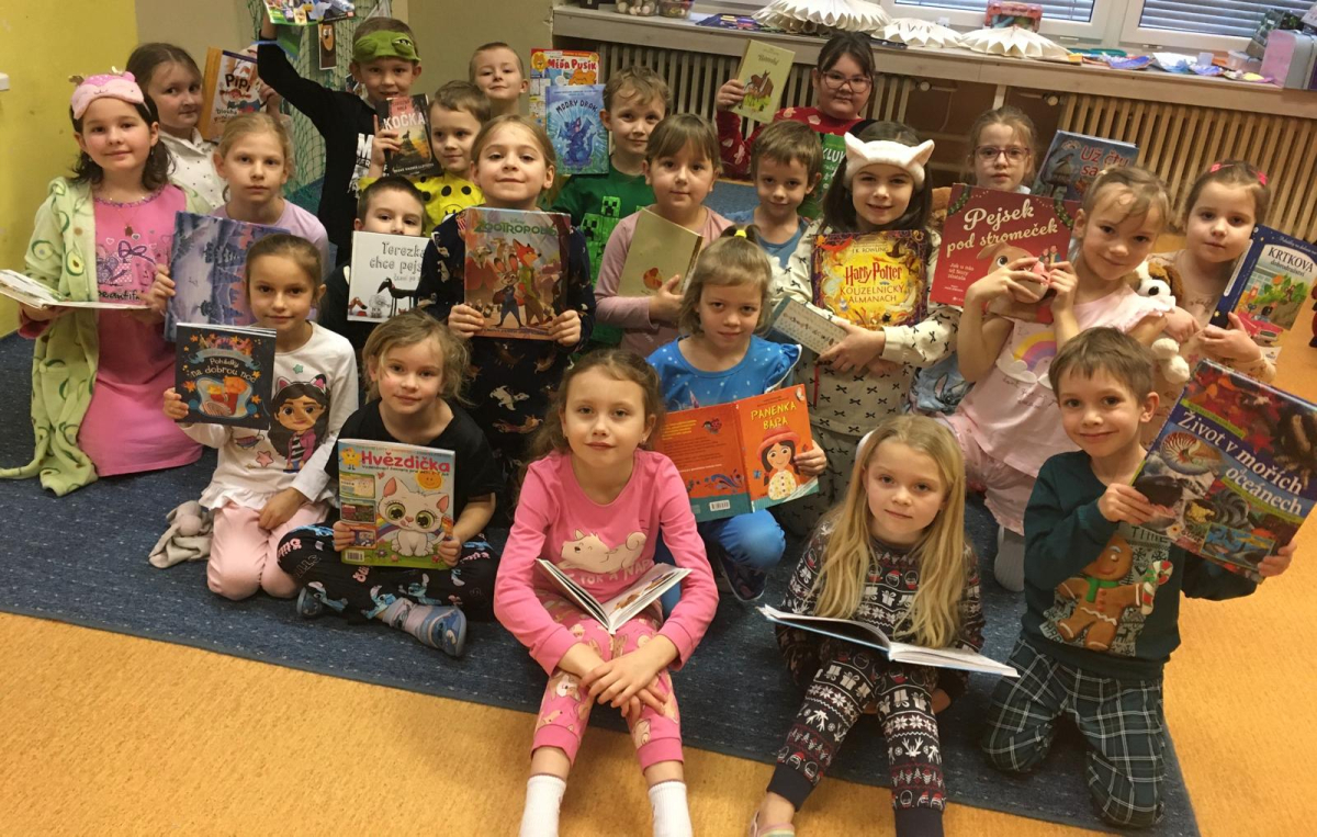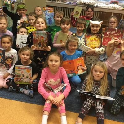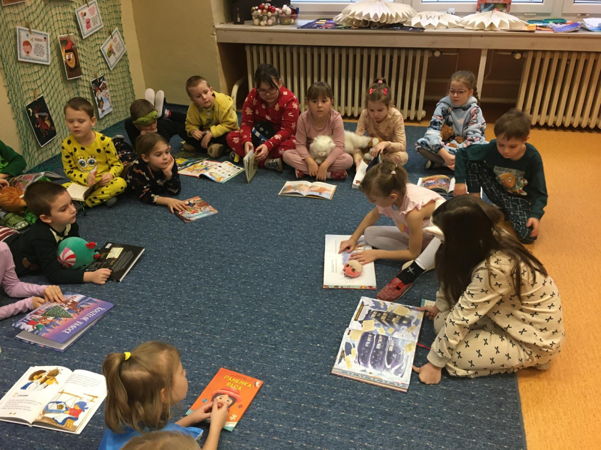 Když v pyžamku , tak s knížkou. Děti si donesly své oblíbené knížky nebo dětské časopisy, které už samy čtou nebo jim večer předčítají rodiče. Každý o své knížce popovídal, co se mu na ní líbí a někteří i kousek přečetli. Dozvěděli se , jak vznikaly první pohádky, kdo je spisovatel a ilustrátor. Potom si všichni zahráli na ilustrátory a vyrobily si svou knížku.