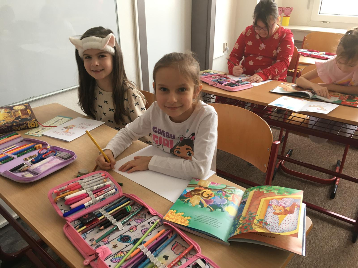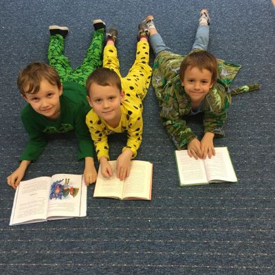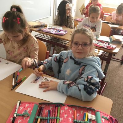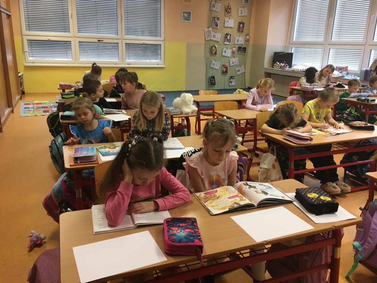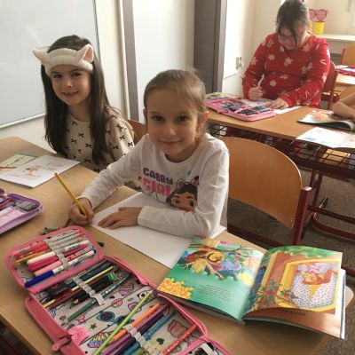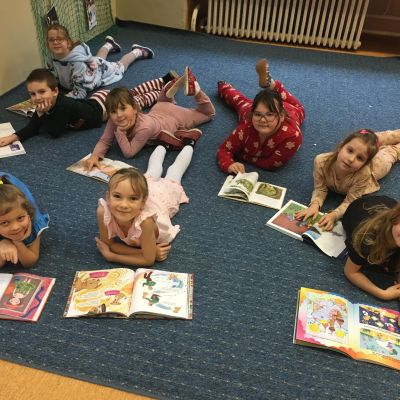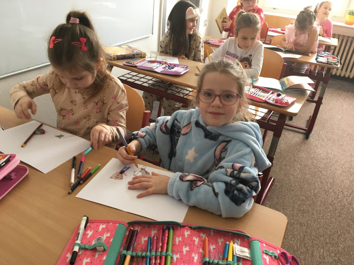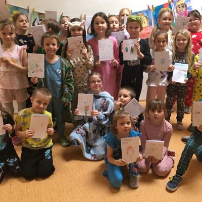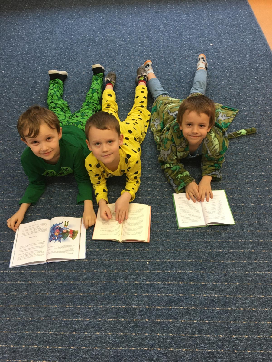 Když v pyžamku , tak s knížkou. Děti si donesly své oblíbené knížky nebo dětské časopisy, které už samy čtou nebo jim večer předčítají rodiče. Každý o své knížce popovídal, co se mu na ní líbí a někteří i kousek přečetli. Dozvěděli se , jak vznikaly první pohádky, kdo je spisovatel a ilustrátor. Potom si všichni zahráli na ilustrátory a vyrobily si svou knížku.
