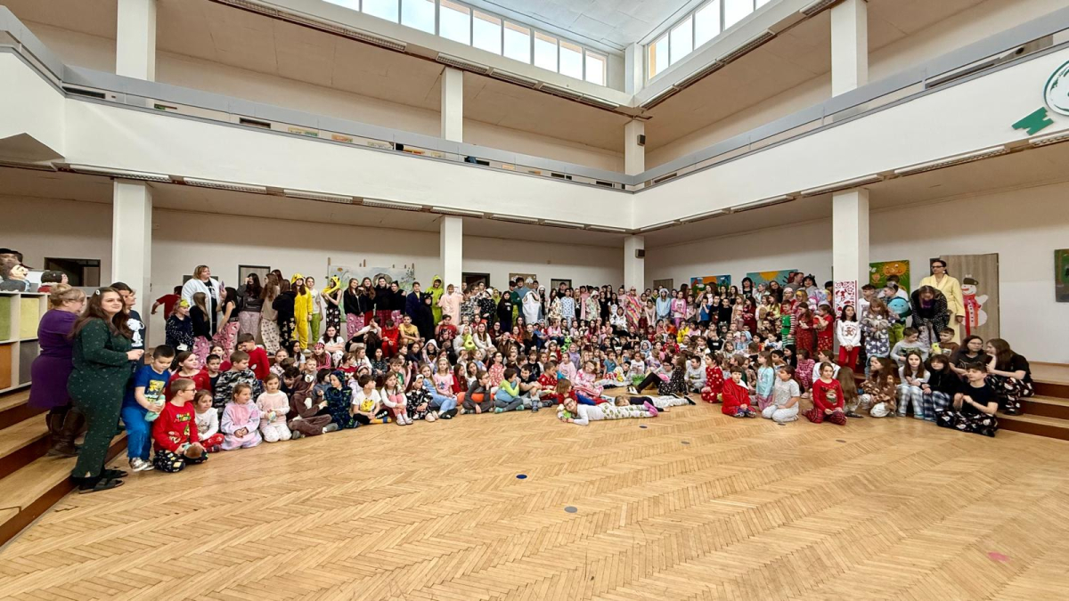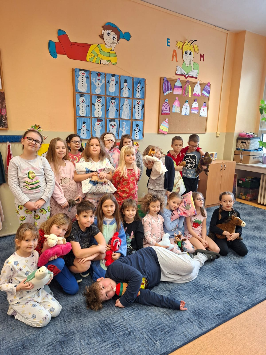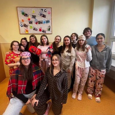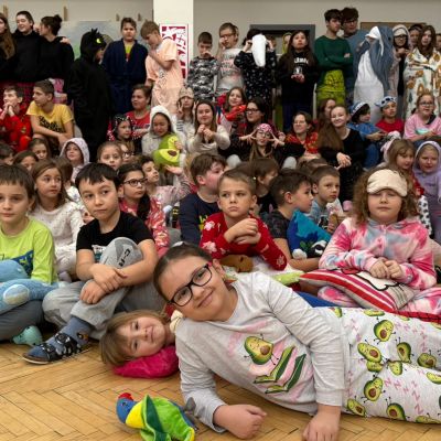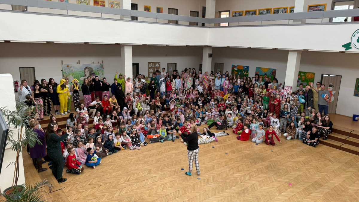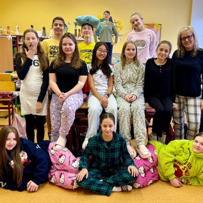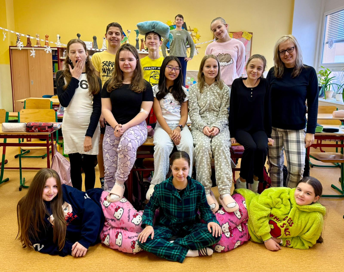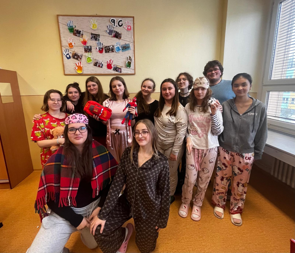 Jak nejlépe strávit školní den? No přece v pyžamu! A tak jsme si první školní pátek roku 2026 udělali radost, přinesli si deky, župany, overaly, plyšáky a další propriety, abychom se o velké přestávce sešli v aule, a že nás bylo, a udělali si jednu báječnou společnou fotografii.